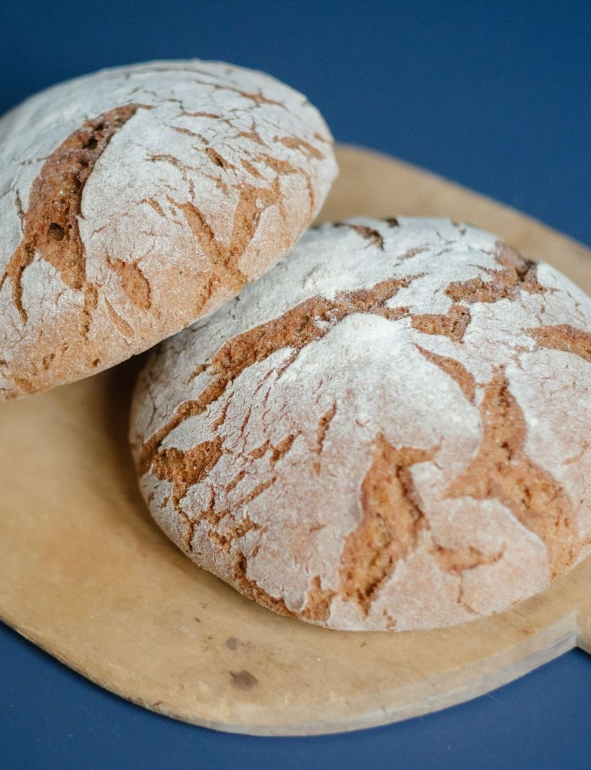 全粒粉は滋賀県の玄麦を石臼で挽いています。自家製のサワー種で発酵するライ麦パンや、酵母種で穏やかに膨らむ素朴で地味深いパンです。